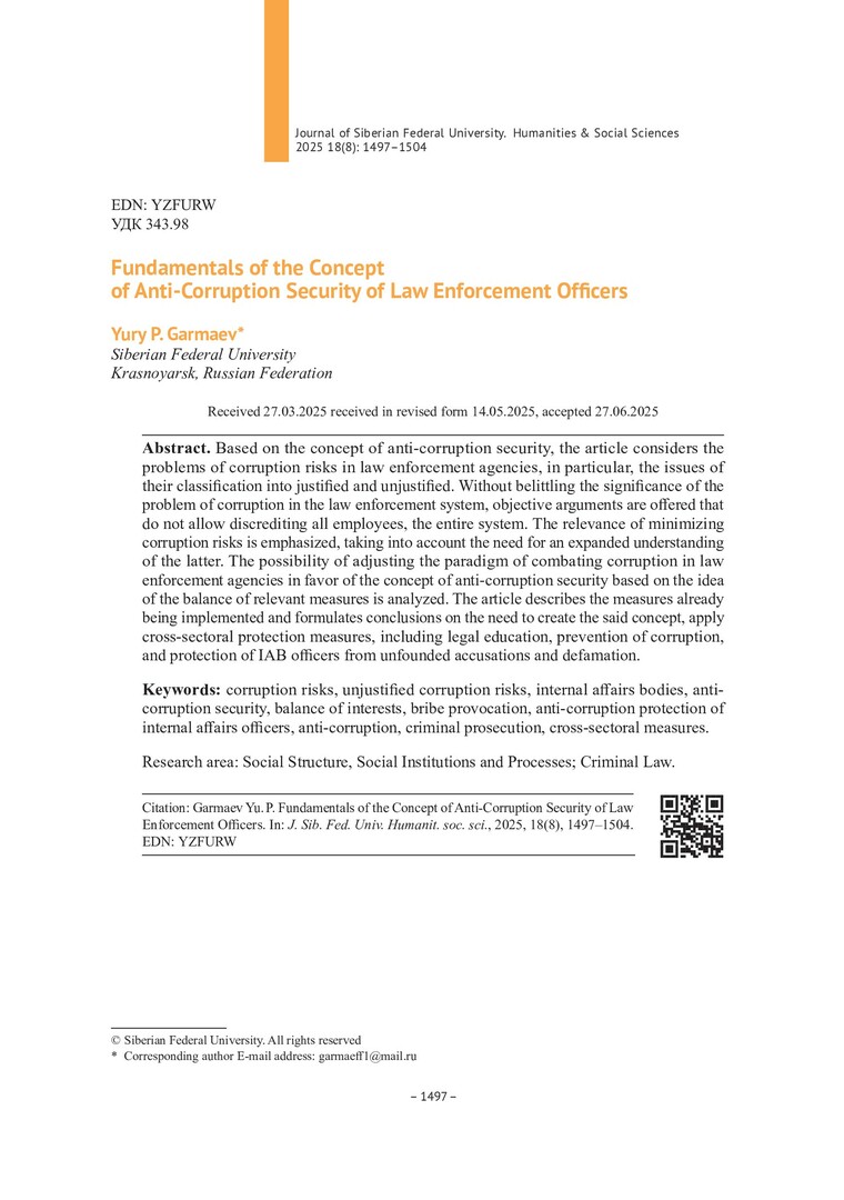 Библиографическое описание:Гармаев, Ю. П. Основы концепции антикоррупционной безопасности сотрудников правоохранительных органов = Fundamentals of the Concept of Anti- Corruption Security of Law Enforcement Officers / Ю. П. Гармаев. - Текст : непосредственный // Журнал Сибирского федерального университета. Гуманитарные науки. - 2025. - Т. 18, № 8. - С. 1497-1504. - Библиогр.: с. 1503-1504. - ISSN 1997-1370.