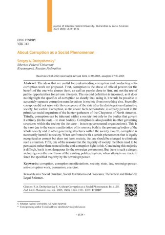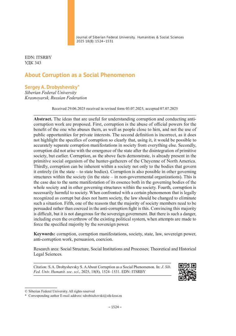 Библиографическое описание:Дробышевский, С. А. О коррупции как о социальном явлении = About Corruption as a Social Phenomenon / С. А. Дробышевский. - Текст : непосредственный // Журнал Сибирского федерального университета. Гуманитарные науки. - 2025. - Т. 18, № 8. - С. 1524-1531. - Библиогр.: с. 1531. - ISSN 1997-1370.