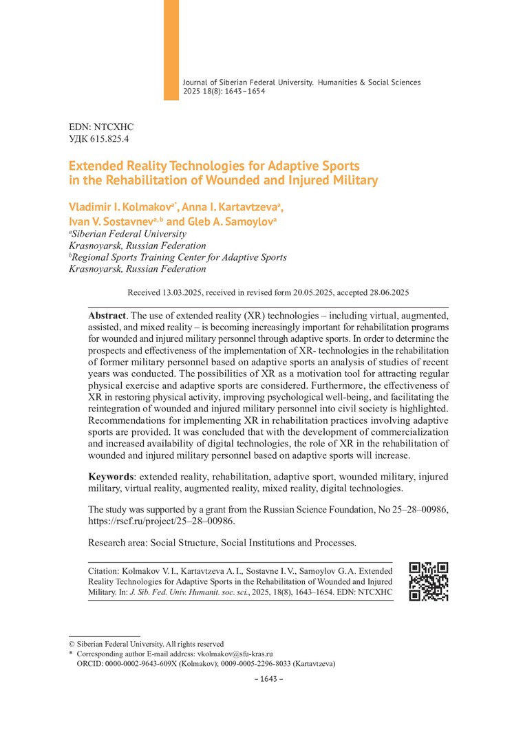 Библиографическое описание:Технологии расширенной реальности для адаптивного спорта в реабилитации раненых и травмированных участников боевых действий = Extended Reality Technologies for Adaptive Sports in the Rehabilitation of Wounded and Injured Military / В. И. Колмаков, А. И. Картавцева, И. В. Составнев, Г. А. Самойлов. - Текст : непосредственный // Журнал Сибирского федерального университета. Гуманитарные науки. - 2025. - Т. 18, № 8. - С. 1643-1654. - Библиогр.: с. 1651-1654. - ISSN 1997-1370.