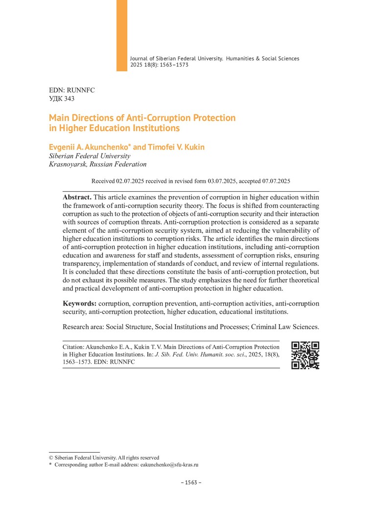 Библиографическое описание:Акунченко, Е. А. Основные направления антикоррупционной защиты образовательной организации высшего образования = Main Directions of Anti-Corruption Protection in Higher Education Institutions / Е. А. Акунченко, Т. В. Кукин. - Текст : непосредственный // Журнал Сибирского федерального университета. Гуманитарные науки. - 2025. - Т. 18, № 8. - С. 1563-1573. - Библиогр.: с. 1570-1573. - ISSN 1997-1370.