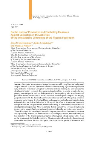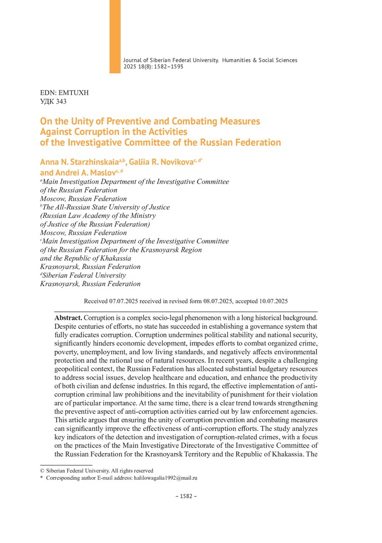 Библиографическое описание:Старжинская, А. Н. О единстве профилактики коррупции и борьбы с ней в деятельности органов Следственного комитета Российской Федерации = On the Unity of Preventive and Combating Measures Against Corruption in the Activities of the Investigative Committee of the Russian Federation / А. Н. Старжинская, Г. Р. Новикова, А. А. Маслов. - Текст : непосредственный // Журнал Сибирского федерального университета. Гуманитарные науки. - 2025. - Т. 18, № 8. - С. 1582-1593. - Библиогр.: с. 1592-1593. - ISSN 1997-1370.