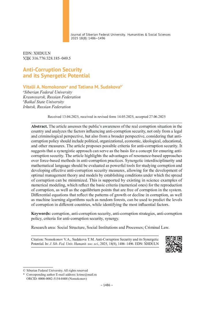 Библиографическое описание:Номоконов, В. А. Антикоррупционная безопасность и ее синергетический потенциал = Anti- Corruption Security and its Synergetic Potential / В. А. Номоконов, Т. М. Судакова. - Текст : непосредственный // Журнал Сибирского федерального университета. Гуманитарные науки. - 2025. - Т. 18, № 8. - С. 1486-1496. - Библиогр.: с. 1496. - ISSN 1997-1370.