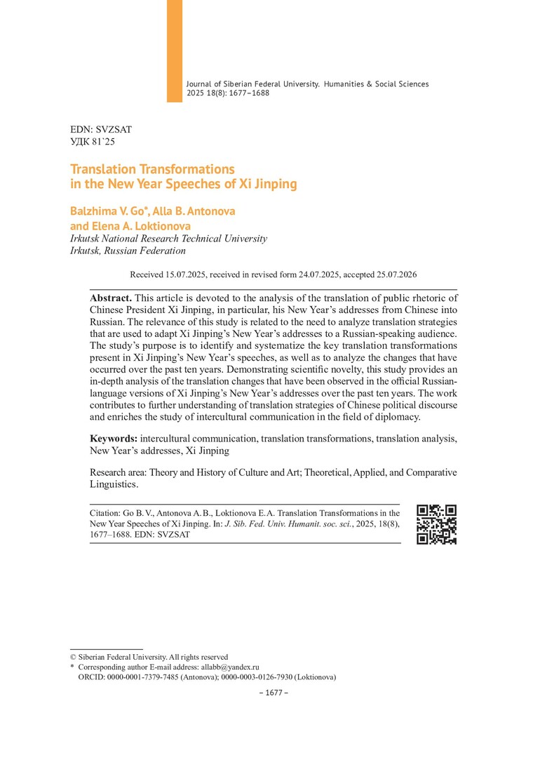 Библиографическое описание:Го, Б. В. Переводческие трансформации в новогодних речах Си Цзиньпина = Translation Transformations in the New Year Speeches of Xi Jinping / Б. В. Го, А. Б. Антонова, Е. А. Локтионова. - Текст : непосредственный // Журнал Сибирского федерального университета. Гуманитарные науки. - 2025. - Т. 18, № 8. - С. 1677-1688. - Библиогр.: с. 1687-1688. - ISSN 1997-1370.