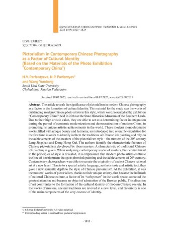 Библиографическое описание:Парфентьева, Н. В. Пикториализм в современной китайской фотографии как фактор культурной идентичности (по материалам фотовыставки "Современный Китай") = Pictorialism in Contemporary Chinese Photography as a Factor of Cultural Identity (Based on the Materials of the Photo Exhibition "Contemporary China") / Н. В. Парфентьева, Н. П. Парфентьев, Ван Юньдун. - Текст : непосредственный // Журнал Сибирского федерального университета. Гуманитарные науки. - 2025. - Т. 18, № 9. - С. 1813-1824. - Библиогр.: с. 1823-1824 . - ISSN 1997-1370.