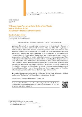 Библиографическое описание:Середкина, Н. Н. "Этноархаика" как художественный стиль произведений хакасского художника Александра Викторовича Доможакова = "Ethnoarchaics" as an Artistic Style of the Works by the Khakass Artist Alexander Viktorovich Domozhakov / Н. Н. Середкина. - Текст : непосредственный // Журнал Сибирского федерального университета. Гуманитарные науки. - 2025. - Т. 18, № 9. - С. 1836-1846. - Библиогр.: с. 1845-1846. - ISSN 1997-1370.