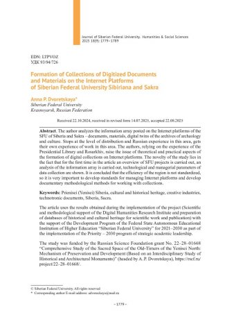 Библиографическое описание:Дворецкая, А. П. Формирование коллекций оцифрованных документов и материалов на интернет-платформах СФУ Сибириана (Siberiana.online) и Сакра (SACRA) = Formation of Collections of Digitized Documents and Materials on the Internet Platforms of Siberian Federal University Sibiriana and Sakra / А. П. Дворецкая. - Текст : непосредственный // Журнал Сибирского федерального университета. Гуманитарные науки. - 2025. - Т. 18, № 9. - С. 1779-1789. - Библиогр.: с. 1788-1789. - ISSN 1997-1370.