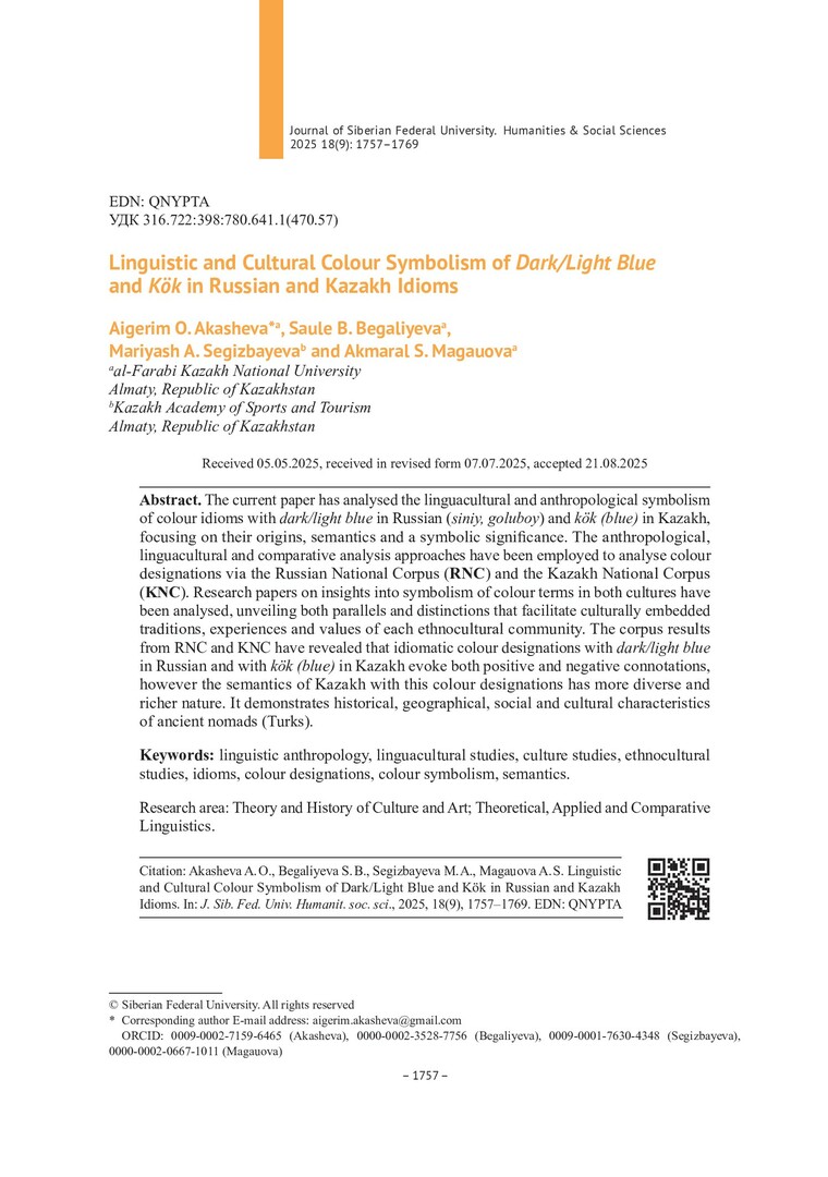 Библиографическое описание:Linguistic and Cultural Colour Symbolism of Dark/Light Blue and Kok in Russian and Kazakh Idioms = Лингвокультурологические аспекты символики цвета синий/голубой и кек в русских и казахских фразеологизмах / A. O. Akasheva, S. B. Begaliyeva, M. A. Segizbayeva, A. S. Magauova. - Текст : непосредственный // Журнал Сибирского федерального университета. Гуманитарные науки. - 2025. - Т. 18, № 9. - С. 1757-1769. - Библиогр.: с. 1767-1769. - ISSN 1997-1370.