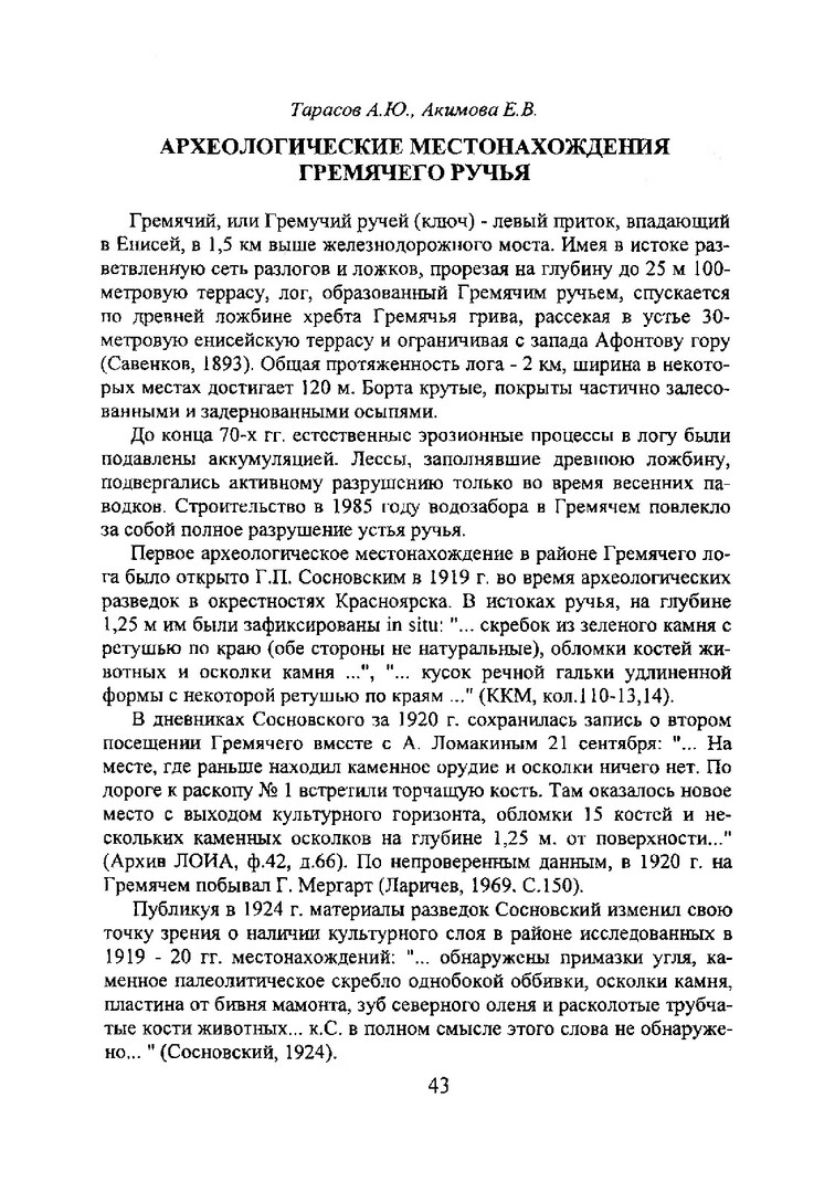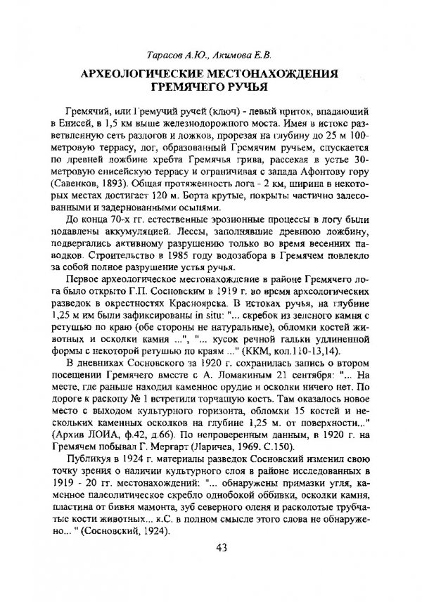 Библиографическое описание:Тарасов, А. Ю. Археологические местонахождения Гремячего ручья / А. Ю. Тарасов, Е. В. Акимова. - Текст : непосредственный // Древности Приенисейской Сибири. - Красноярск : КрасГУ, 1996. - Вып. I. - С. 43-46. - Библиогр. в конце ст.