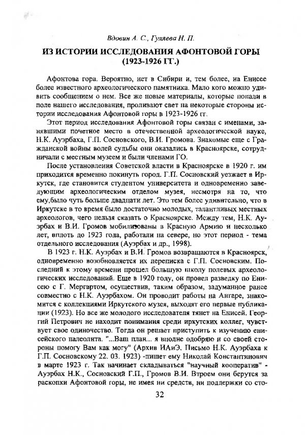 Библиографическое описание:Вдовин, Александр Сергеевич. Из истории исследования Афонтовой горы (1923-1926 гг.) / А. С. Вдовин, Н. П. Гуляева. - Текст : непосредственный // Древности Приенисейской Сибири. - Красноярск : КрасГУ, 1996. - Вып. I. - С. 32-42. - Библиогр. в конце ст.