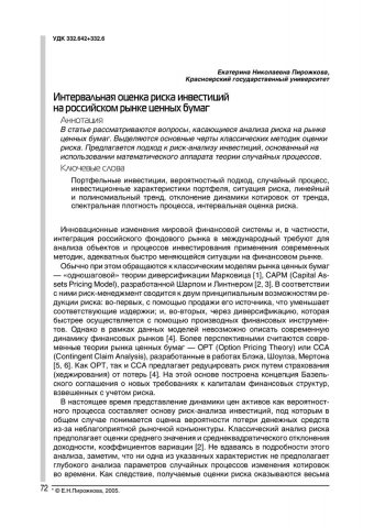 Библиографическое описание:Пирожкова, Екатерина Николаевна. Интервальная оценка риска инвестиций на российском рынке ценных бумаг / Е. Н. Пирожкова. - Текст : непосредственный // Экономические проблемы и решения. - 2005. - № 3. - С. 72-83. - Библиогр. в конце ст. - ISSN 1811-7880.