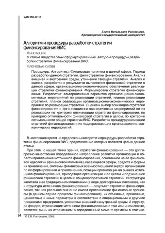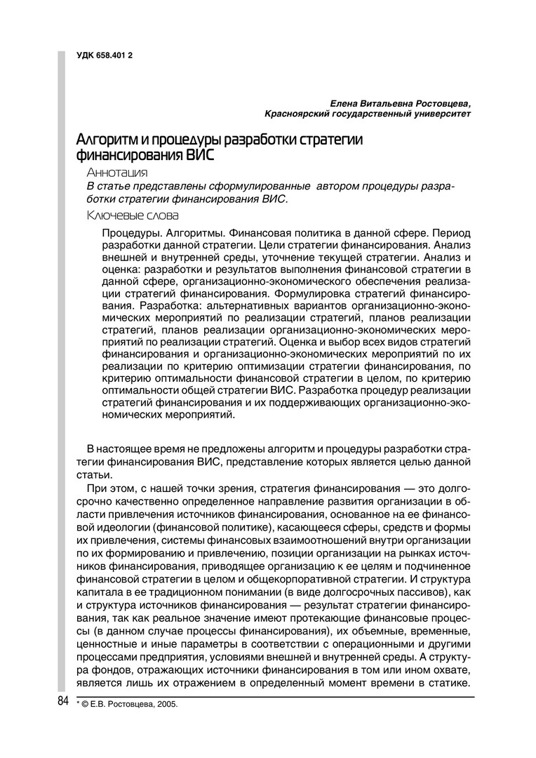 Библиографическое описание:Ростовцева, Елена Витальевна. Алгоритм и процедуры разработки стратегии финансирования ВИС / Е. В. Ростовцева. - Текст : непосредственный // Экономические проблемы и решения. - 2005. - № 3. - С. 84-103. - Библиогр. в конце ст. - ISSN 1811-7880.