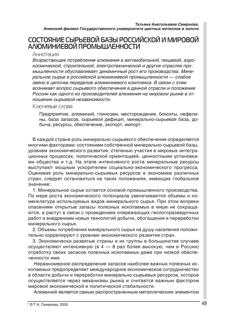 Библиографическое описание:Смирнова, Татьяна Анатольевна. Состояние сырьевой базы российской и мировой алюминиевой промышленности / Т. А. Смирнова. - Текст : электронный // Экономические проблемы и решения. - 2005. - № 4. - С. 49-60. - Библиогр. в конце ст. - ISSN 1811-7880.