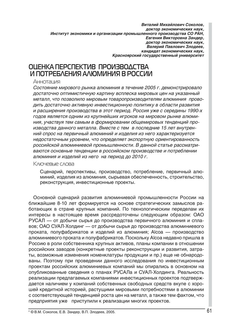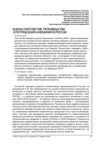 Библиографическое описание:Соколов, Виталий Михайлович. Оценка перспектив производства и потребления алюминия в России / В. М. Соколов, Е. В. Зандер, В. П. Злодеев. - Текст : электронный // Экономические проблемы и решения. - 2005. - № 4. - С. 61-70. - Библиогр. в конце ст. - ISSN 1811-7880.