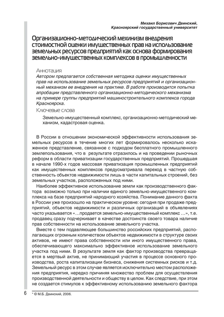 Организационно-методический механизм внедрения стоимостной оценки имущественных прав на использование земельных ресурсов предприятий как основа формирования земельно-имущественных комплексов в промышленности