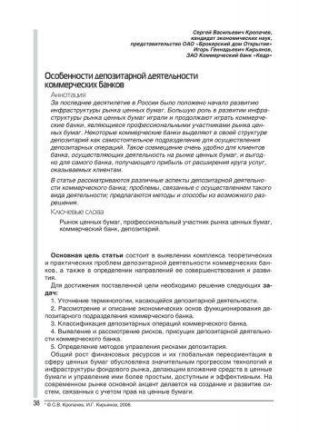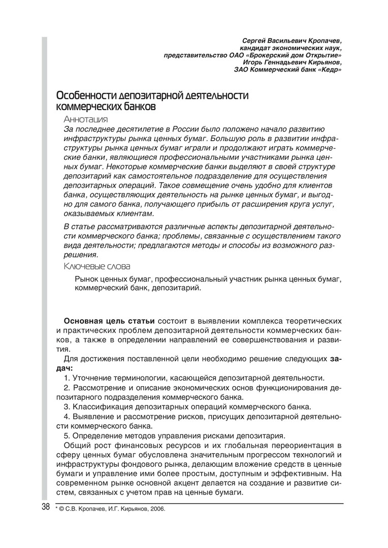 Библиографическое описание:Кропачев, Сергей Васильевич. Особенности депозитарной деятельности коммерческих банков / С. В. Кропачев, И. Г. Кирьянов. - Текст : электронный // Экономические проблемы и решения. - 2006. - № 6. - С. 38-52. - Библиогр. в конце ст. - ISSN 1811-7880.