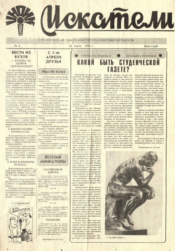 Искатели : газета. 1993 г. № 3 (29 марта)выпуск журнала/газеты