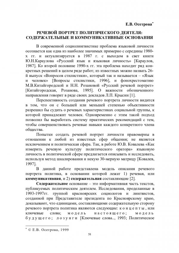 Библиографическое описание:Осетрова, Елена Валерьевна. Речевой портрет политического деятеля: содержательные и коммуникативные основания / Е. В. Осетрова. - Текст : непосредственный // Лингвистический ежегодник Сибири. - 1999. - Вып. 1. - С. 58-67. - Библиогр. в конце ст. - ISSN 1817-1222.