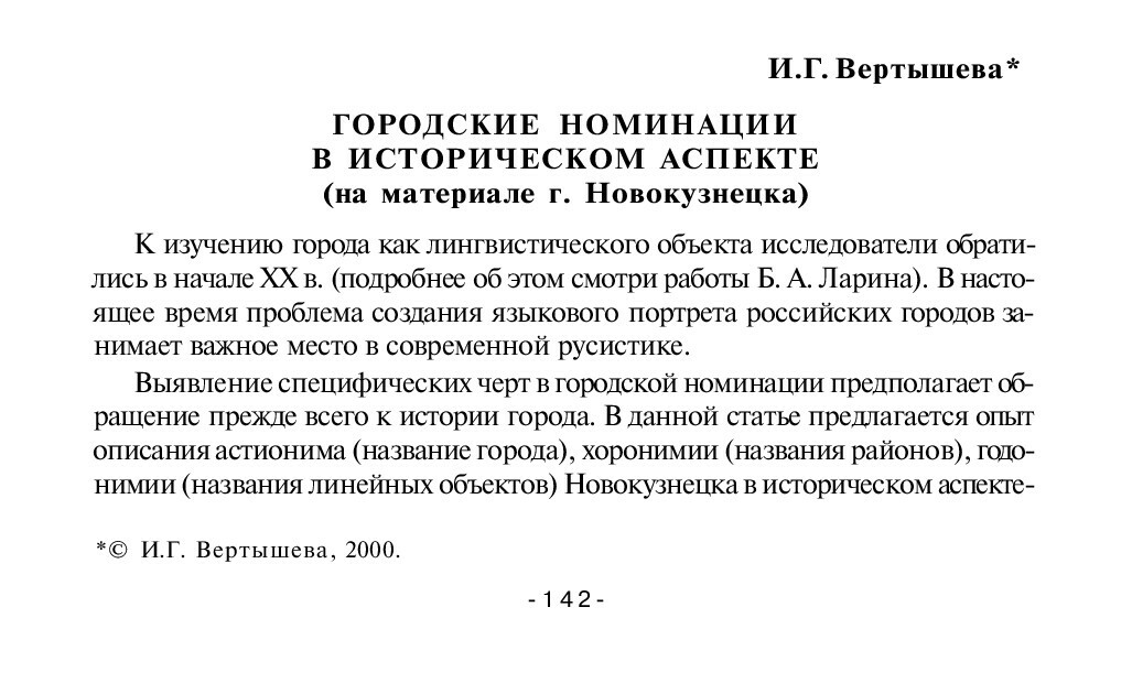 Библиографическое описание:Вертышева, И. Г. Городские номинации в историческом аспекте (на материале г. Новокузнецка) / И. Г. Вертышева. - Текст : непосредственный // Лингвистический ежегодник Сибири. - 2000. - Вып. 2. - С. 142-145. - Библиогр. в конце ст. - ISSN 1817-1222.
