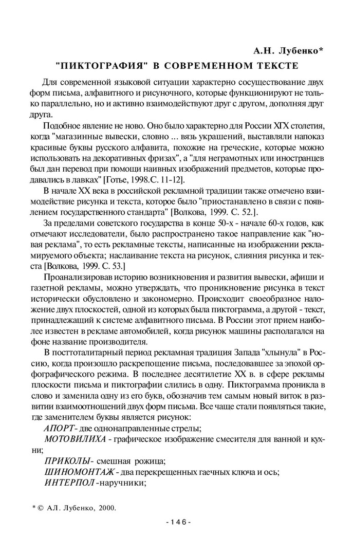 Лубенко, Александра Н... "Пиктография" в современном тексте / А. Н. Лубенко. - Текст : непосредственный // Лингвистический ежегодник Сибири. - 2000. - Вып. 2. - С. 146-147. - Библиогр. в конце ст. - ISSN 1817-1222.