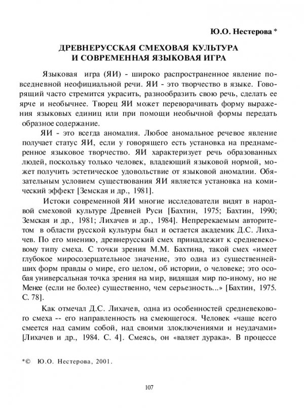 Библиографическое описание:Нестерова, Юлия Олеговна. Древнерусская смеховая культура и современная языковая игра / Ю. О. Нестерова. - Текст : непосредственный // Лингвистический ежегодник Сибири. - 2001. - Вып. 3. - С. 107-110. - Библиогр. в конце ст. - ISSN 1817-1222.