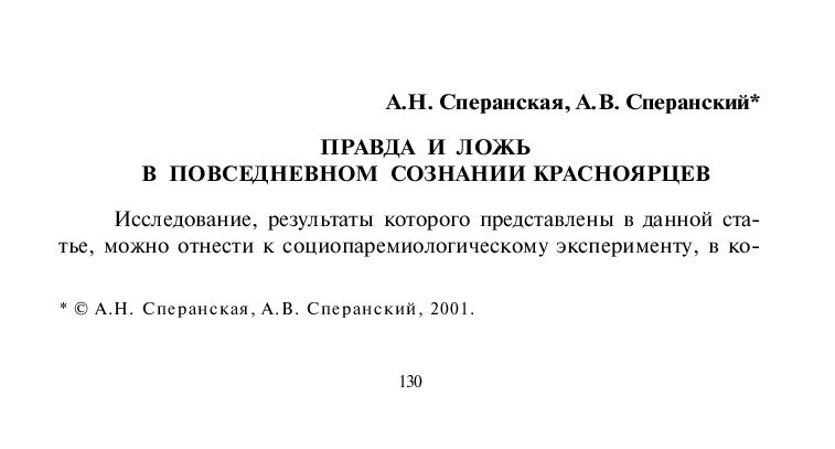 Библиографическое описание:Сперанская, Алевтина Николаевна. Правда и ложь в повседневном сознании красноярцев : [результаты исследования - социопаремиологического эксперимента] / А. Н. Сперанская, А. В. Сперанский. - Текст : непосредственный // Лингвистический ежегодник Сибири. - 2001. - Вып. 3. - С. 130-143. - Библиогр. в конце ст. - ISSN 1817-1222.