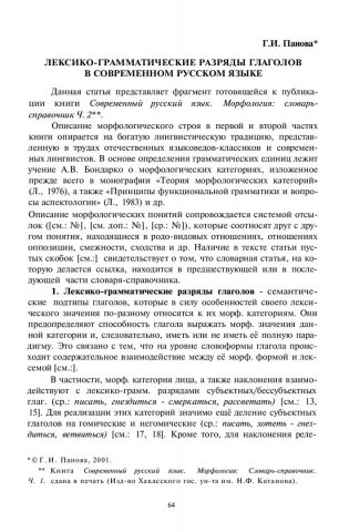 Панова, Галина Ивановна. Лексико-грамматические разряды глаголов в современном русском языке / Г. И. Панова. - Текст : непосредственный // Лингвистический ежегодник Сибири. - 2001. - Вып. 3. - С. 64-74. - ISSN 1817-1222.