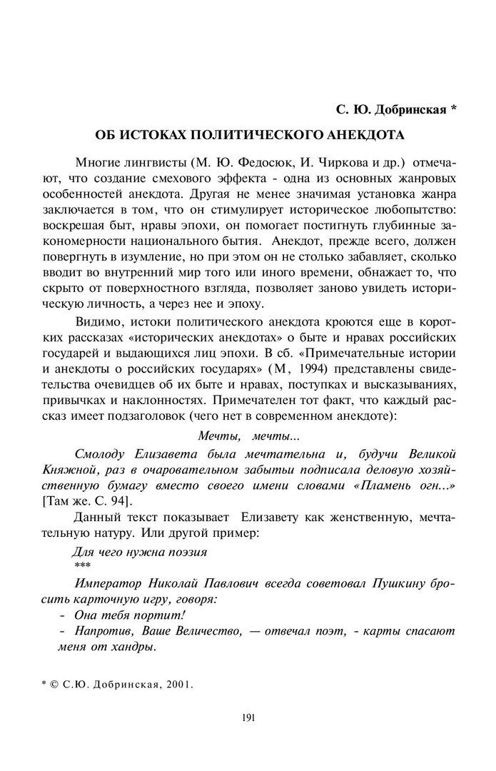 Добринская, Светлана Юрьевна. Об истоках политического анекдота / С. Ю. Добринская. - Текст : непосредственный // Лингвистический ежегодник Сибири. - 2001. - Вып. 3. - С. 191-194. - Библиогр. в конце ст. - ISSN 1817-1222.