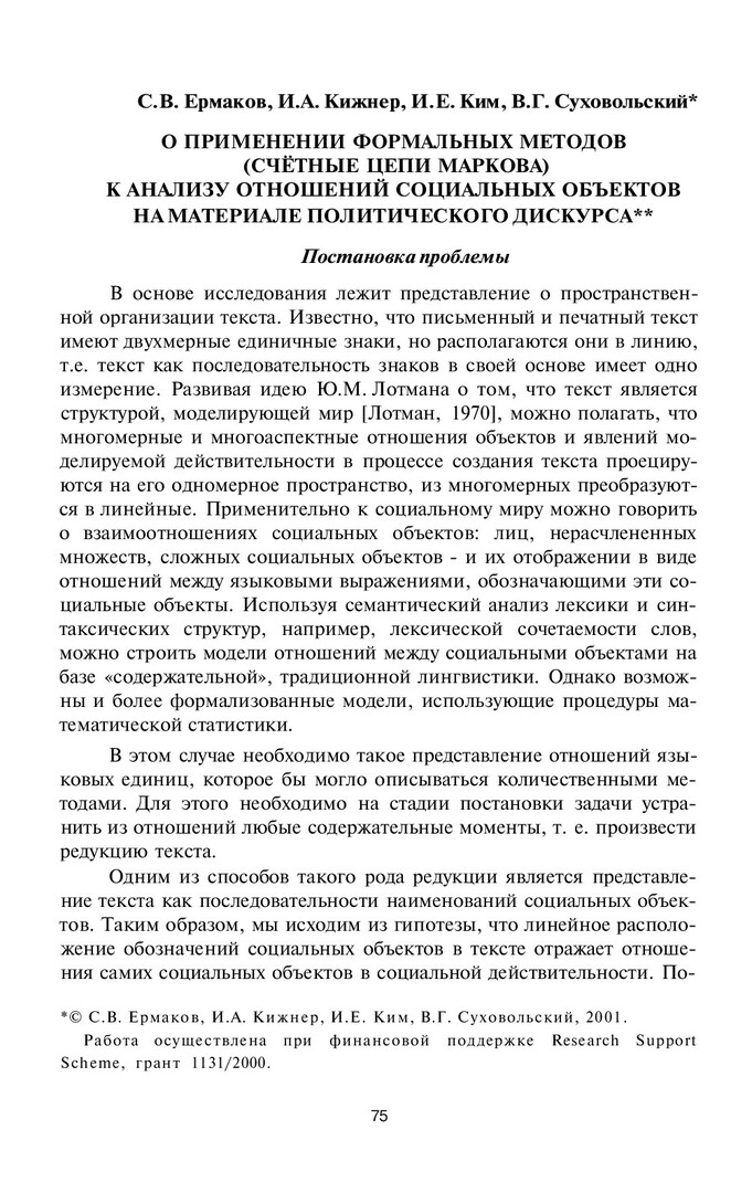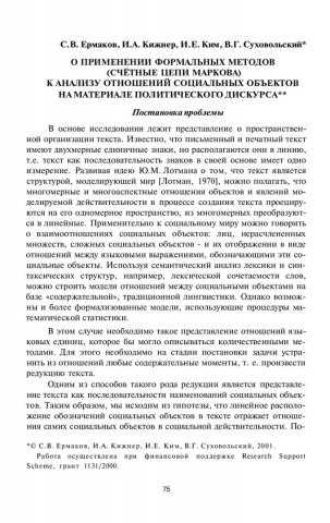Библиографическое описание:О применении формальных методов (счетные цепи Маркова) к анализу отношений социальных объектов на материале политического дискурса / С. В. Ермаков, И. А. Кижнер, И. Е. Ким, Владислав Григорьевич Суховольский. - Текст : непосредственный // Лингвистический ежегодник Сибири. - 2001. - Вып. 3. - С. 75-88. - Библиогр. в конце ст. - ISSN 1817-1222.