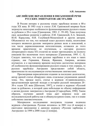 Библиографическое описание:Анцыпова, Антонина Николаевна. Английские вкрапления в письменной речи русских эмигрантов Австралии / А. Н. Анцыпова. - Текст : непосредственный // Лингвистический ежегодник Сибири. - 2003. - Вып. 4/5. - С. 20-26. - Библиогр. в конце ст. - ISSN 1817-1222.