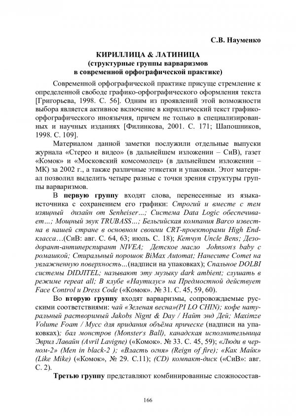 Библиографическое описание:Науменко, Светлана Васильевна. Кириллица & латиница (структурные группы варваризмов в современной орфографической практике) / С. В. Науменко. - Текст : непосредственный // Лингвистический ежегодник Сибири. - 2003. - Вып. 4/5. - С. 166-169. - Библиогр. в конце ст. - ISSN 1817-1222.