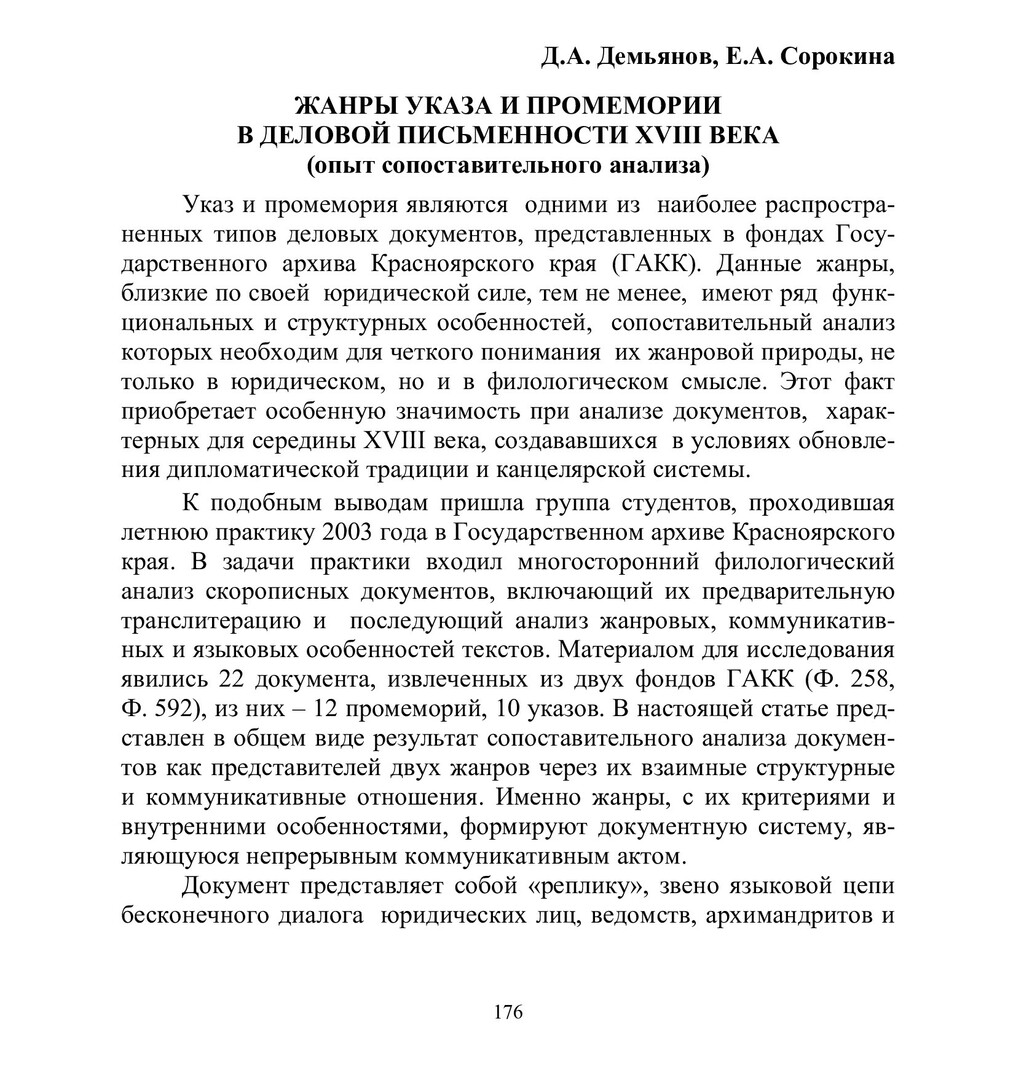 Библиографическое описание:Демьянов, Денис Алексеевич. Жанры указа и промемории в деловой письменности XVIII века (опыт сопоставительного анализа) / Д. А. Демьянов, Е. А. Сорокина. - Текст : непосредственный // Лингвистический ежегодник Сибири. - 2004. - Вып. 6. - С. 176-184. - Библиогр. в конце ст. - ISSN 1817-1222.