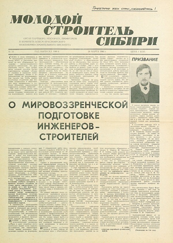 Библиографическое описание:Молодой строитель Сибири : газета/ Красноярский инженерно-строительный институт. - Красноярск : КИСИ, 1986 - - [1992] 1986г. N 10 (28 марта)