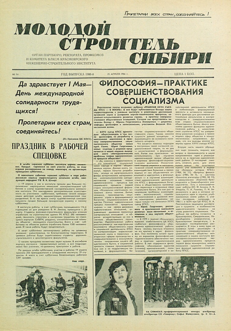 Библиографическое описание:Молодой строитель Сибири : газета/ Красноярский инженерно-строительный институт. - Красноярск : КИСИ, 1986 - - [1992] 1986г. N 14 (25 апреля)