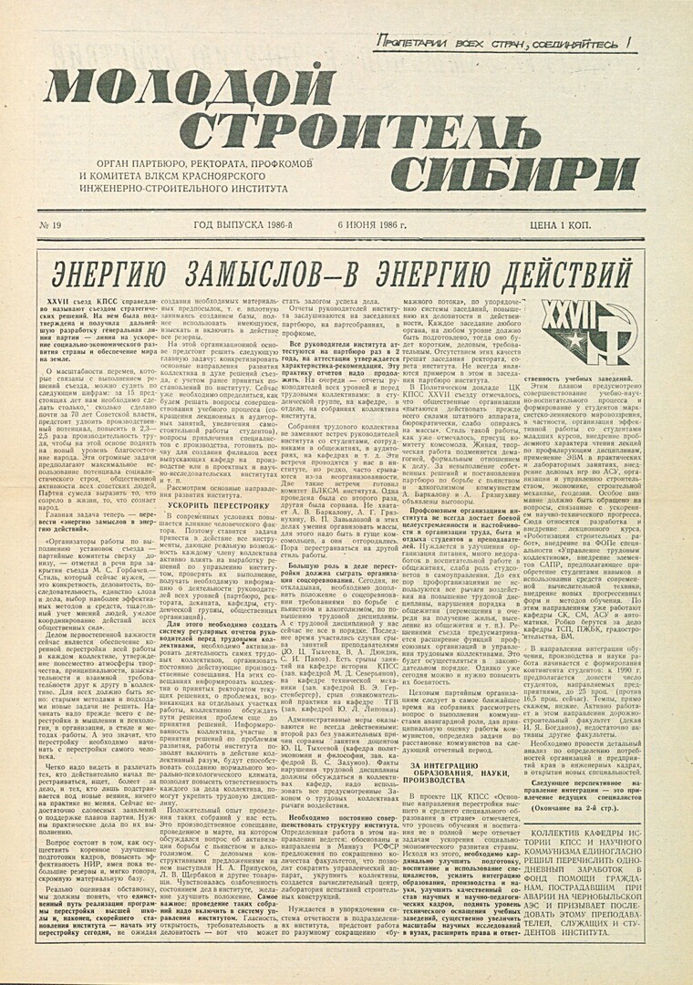 Библиографическое описание:Молодой строитель Сибири : газета/ Красноярский инженерно-строительный институт. - Красноярск : КИСИ, 1986 - - [1992] 1986г. N 19 (6 июня)