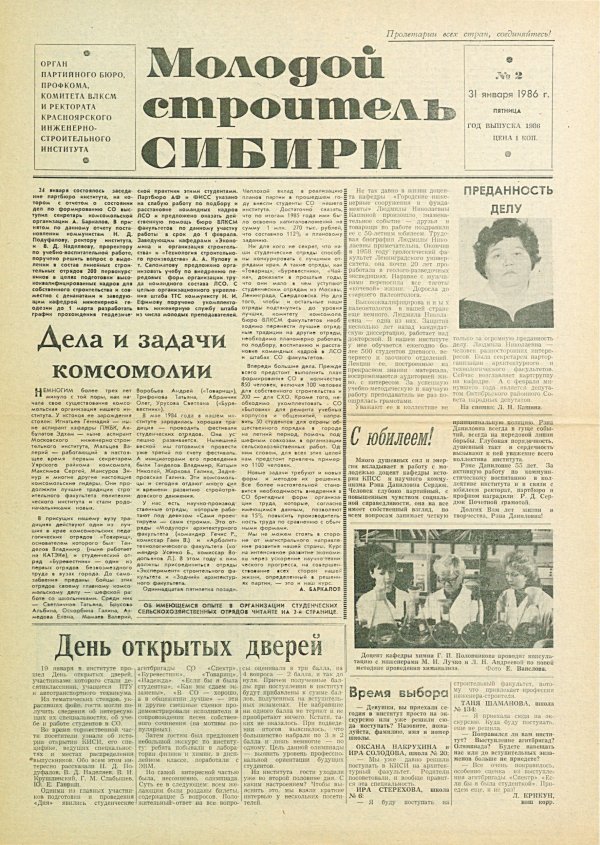 Библиографическое описание:Молодой строитель Сибири : газета/ Красноярский инженерно-строительный институт. - Красноярск : КИСИ, 1986 - - [1992] 1986г. N 2 (31 января)