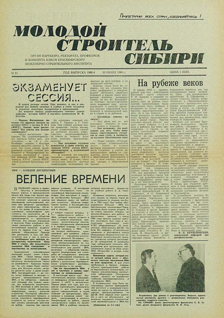 Библиографическое описание:Молодой строитель Сибири : газета/ Красноярский инженерно-строительный институт. - Красноярск : КИСИ, 1986 - - [1992] 1986г. N 21 (20 июня)