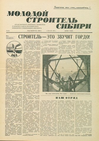 Библиографическое описание:Молодой строитель Сибири : газета/ Красноярский инженерно-строительный институт. - Красноярск : КИСИ, 1986 - - [1992] 1986г. N 23 (4 июля)