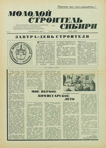 Библиографическое описание:Молодой строитель Сибири : газета/ Красноярский инженерно-строительный институт. - Красноярск : КИСИ, 1986 - - [1992] 1986г. N 24 (9 августа)