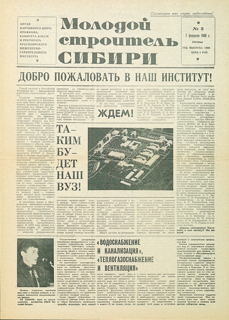 Библиографическое описание:Молодой строитель Сибири : газета/ Красноярский инженерно-строительный институт. - Красноярск : КИСИ, 1986 - - [1992] 1986г. N 3 (7 февраля)