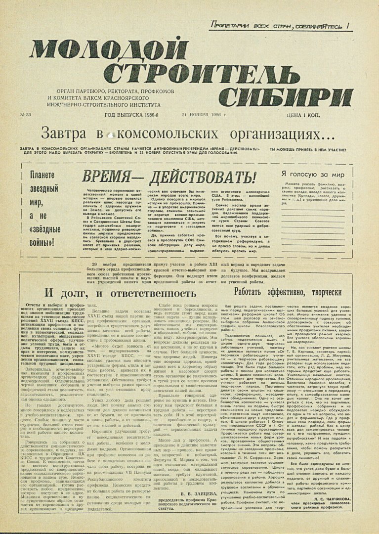 Библиографическое описание:Молодой строитель Сибири : газета/ Красноярский инженерно-строительный институт. - Красноярск : КИСИ, 1986 - - [1992] 1986г. N 33 (21 ноября)