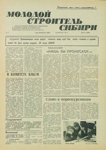 Библиографическое описание:Молодой строитель Сибири : газета/ Красноярский инженерно-строительный институт. - Красноярск : КИСИ, 1986 - - [1992] 1986г. N 36 (12 декабря)