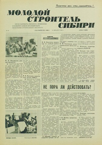 Библиографическое описание:Молодой строитель Сибири : газета/ Красноярский инженерно-строительный институт. - Красноярск : КИСИ, 1986 - - [1992] 1986г. N 37 (19 декабря)