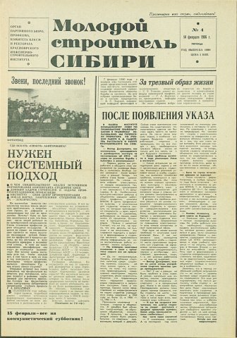 Библиографическое описание:Молодой строитель Сибири : газета/ Красноярский инженерно-строительный институт. - Красноярск : КИСИ, 1986 - - [1992] 1986г. N 4 (14 февраля)
