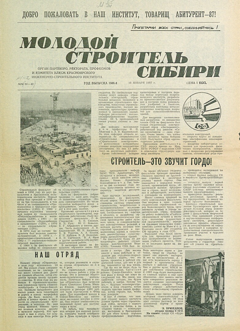 Библиографическое описание:Молодой строитель Сибири : газета/ Красноярский инженерно-строительный институт. - Красноярск : КИСИ, 1986 - - [1992] 1987г. N 1/2 (39-40) (16 января)