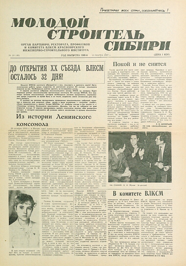 Библиографическое описание:Молодой строитель Сибири : газета/ Красноярский инженерно-строительный институт. - Красноярск : КИСИ, 1986 - - [1992] 1987г. N 10 (48) (13 марта)