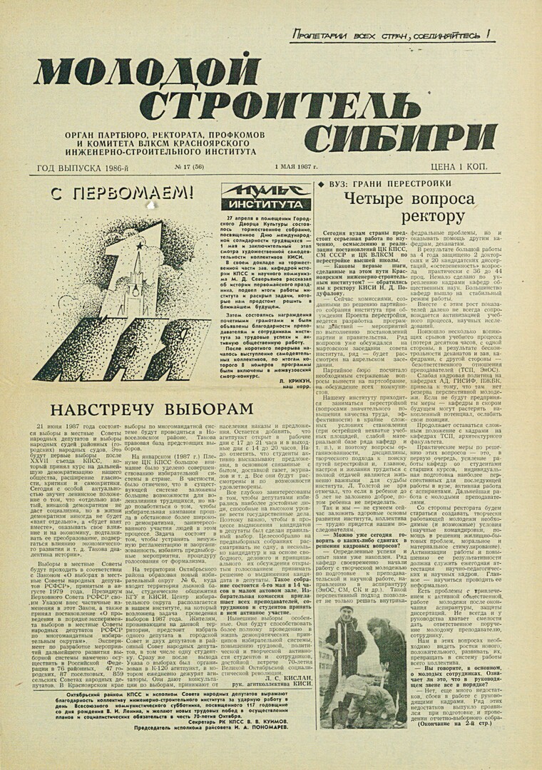 Библиографическое описание:Молодой строитель Сибири : газета/ Красноярский инженерно-строительный институт. - Красноярск : КИСИ, 1986 - - [1992] 1987г. N 17 (56) (1 мая)