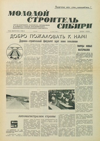 Библиографическое описание:Молодой строитель Сибири : газета/ Красноярский инженерно-строительный институт. - Красноярск : КИСИ, 1986 - - [1992] 1987г. N 23 (62) (12 июня)
