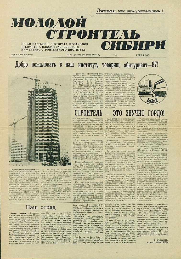 Библиографическое описание:Молодой строитель Сибири : газета/ Красноярский инженерно-строительный институт. - Красноярск : КИСИ, 1986 - - [1992] 1987г. N 24/25 (63-64) (26 июня)