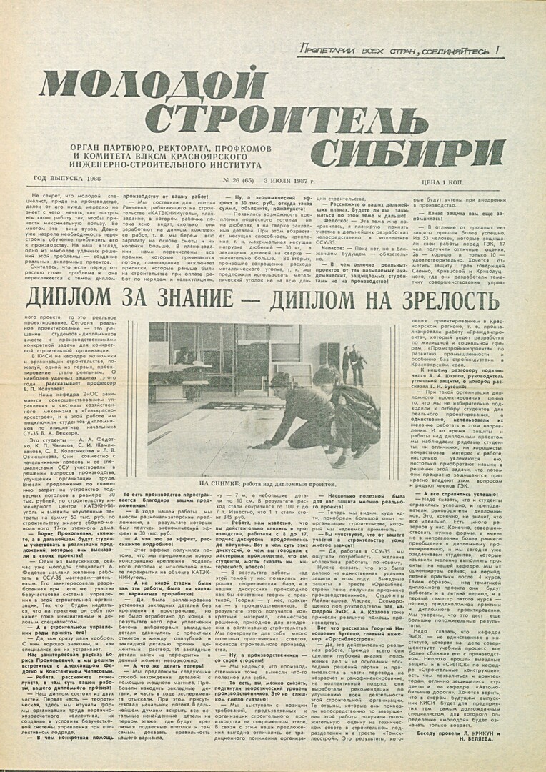 Библиографическое описание:Молодой строитель Сибири : газета/ Красноярский инженерно-строительный институт. - Красноярск : КИСИ, 1986 - - [1992] 1987г. N 26 (65) (3 июля)