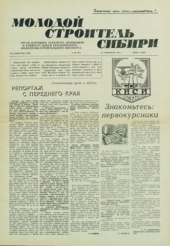 Библиографическое описание:Молодой строитель Сибири : газета/ Красноярский инженерно-строительный институт. - Красноярск : КИСИ, 1986 - - [1992] 1987г. N 28 (67) (25 сентября)